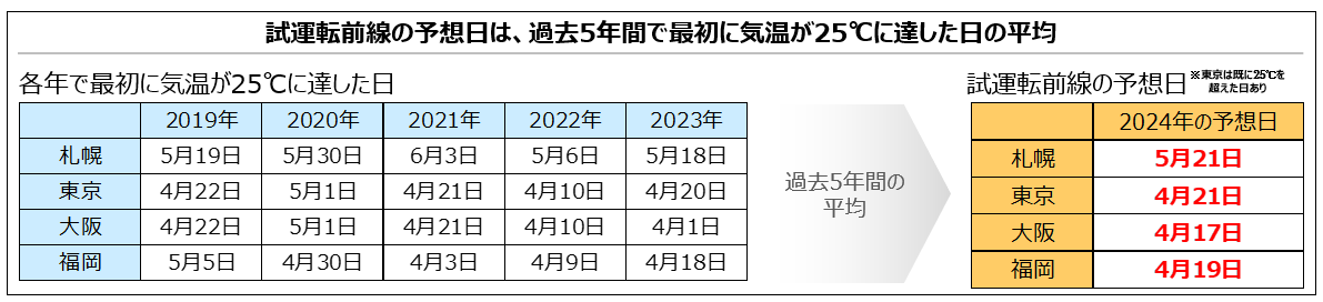 こうした考え方で各地の予想日を見ていくと、今年の試運転前線は、4月上旬に那覇に上陸し、4月中旬には九州・中四国から太平洋沿岸地域へ、その後本州を北上し、5月後半に札幌へ到達する予想です。現在、地域によっては既に25℃以上の日もあり、早めの試運転をおすすめします。