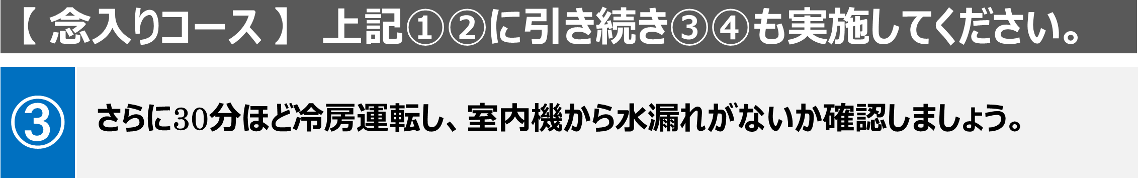 エアコンは冷房運転時、室内機の中にある熱交換器が冷やされて結露水が発生します。発生した結露水はドレン配管とよばれるホースで屋外に排水されます。30分程度の冷房運転で結露水を十分に発生させ、屋外のドレン配管から水が出てくるところまで確認できれば安心です。