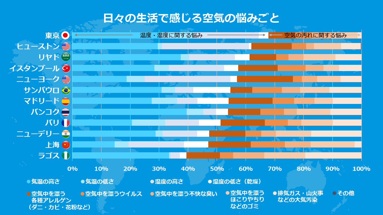 ダイキン工業株式会社は、このたび世界12都市に住む1,200人を対象に、各国のエアコンと空気に関わる意識・文化について調べる「ダイキン 世界の空気感調査」を実施しました。