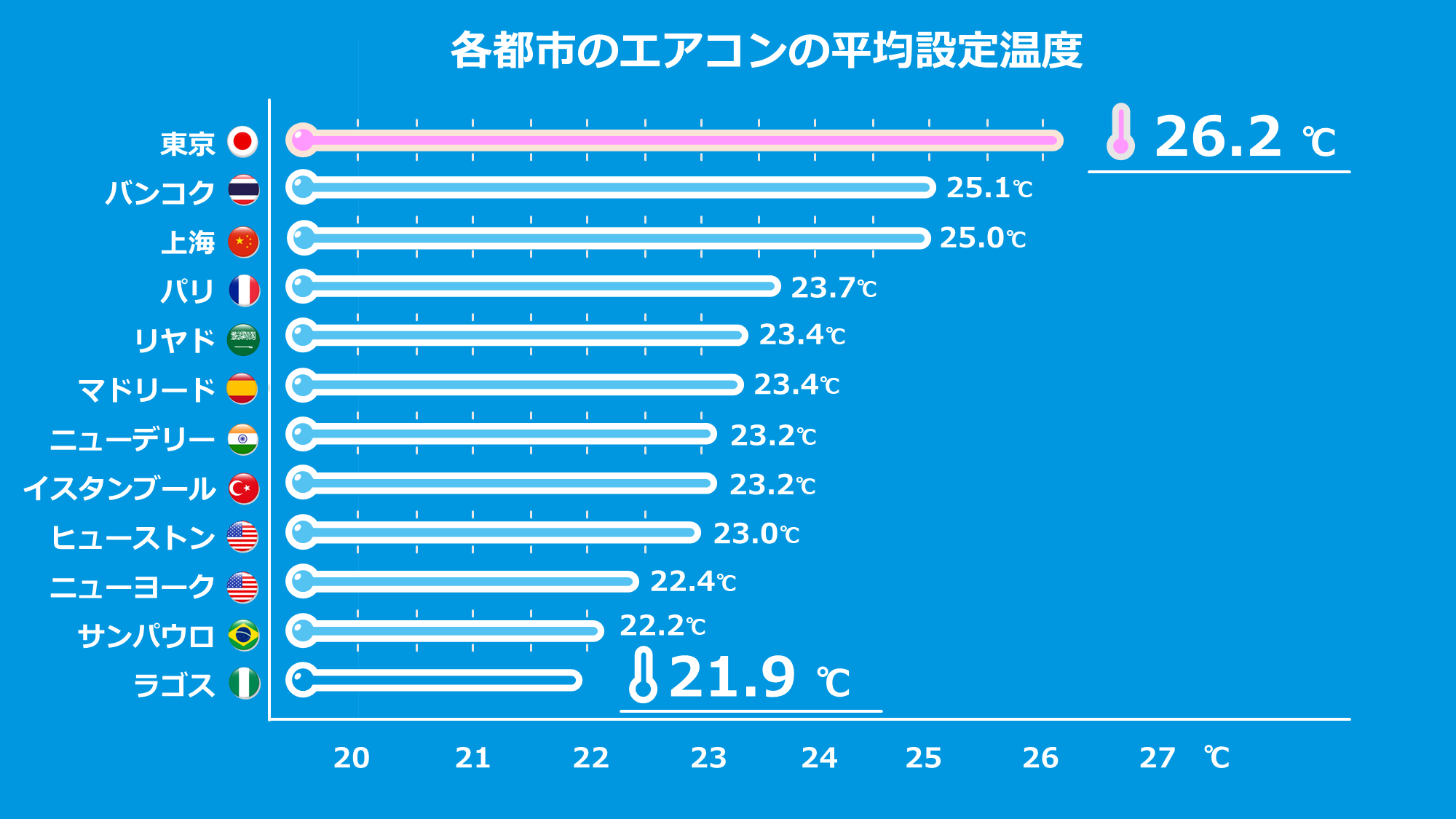 一方、アジア圏の東京、バンコク(タイ)、上海(中国)の平均設定温度はその他の都市と比べると高めの結果となりました(東京:26.2℃、バンコク:25.1℃、上海:25.0℃)。アジア圏では寒さに敏感であったり、省エネのために温度が過度に低くならないよう気を付けたりする人が多いのかもしれません。
