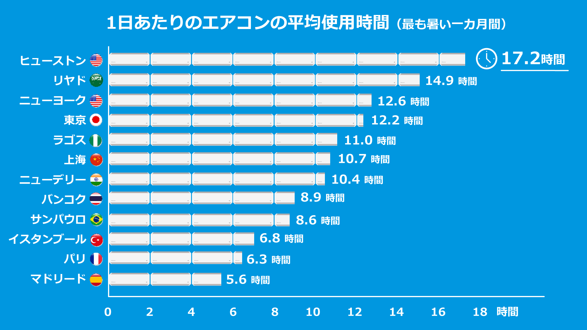 各都市の人々は、暑い時期に1日何時間程度、エアコンを利用するのでしょうか。「1年で最も気温が高い月に終日自宅で過ごすときのエアコン(冷房)の平均使用時間※3」を算出しました。その結果、ヒューストン(アメリカ)が17.2時間で最も長く、かつ、41%の人が「24時間」使用するという驚きの結果となりました。次いでリヤド(サウジアラビア)が14.9時間、ニューヨーク(アメリカ)が12.6時間の順に、長時間エアコンを使用することがわかりました。アメリカの戸建て住宅では、全館空調システムが広く普及しており、こうした機器を使用している人々はエアコンをこまめにオン・オフせず、「つけっぱなし」にするのが当たり前になっているようです。