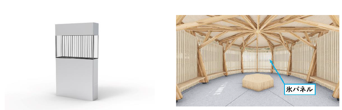 氷のクールスポットは、氷や雪を貯蔵することで冷温貯蔵庫として用いられてきた昔ながらの氷室(ひむろ)から着想を得ています。氷蓄熱空調※2の技術を応用して生成した氷の冷輻射※3により、木陰に入ったときに感じるような涼しさを提供します。氷の生成には太陽光パネルで発電した電気を一部利用するなど、環境に配慮した仕組みを取り入れています。壁には日本古来の木組み格子を使用し、屋外にいるような雰囲気を感じることができる開放感のある構造にしています。屋根には意匠性の高い太陽光パネルを搭載し、自然と調和したデザインにしています。