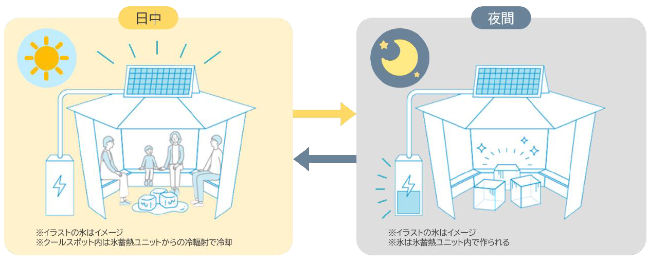 氷のクールスポットでは太陽光パネルにより発電した電気を一部利用します。日中に発電した電気を蓄電池に貯めておき、涼しい夜間に氷を作ります。