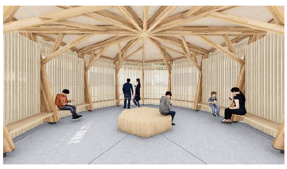 氷のクールスポット内部には、約30名が座れるベンチを配置しています。高さ3.3~3.7mと勾配をつけた高天井と木材を多用した内装により、安らげる空間を実現します。内壁と外壁には日本古来の木組み格子を使用することで、屋外と屋内の境目がない開放的な構造にしています。氷のクールスポットの屋根には、周囲の木々と調和した緑色の太陽光パネルを搭載しており、大阪・関西万博のシンボルとなる大屋根から見下ろした時にも、自然と溶け込んだデザインにしています。