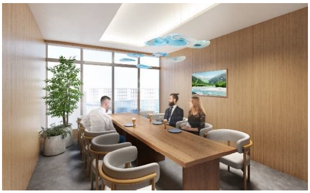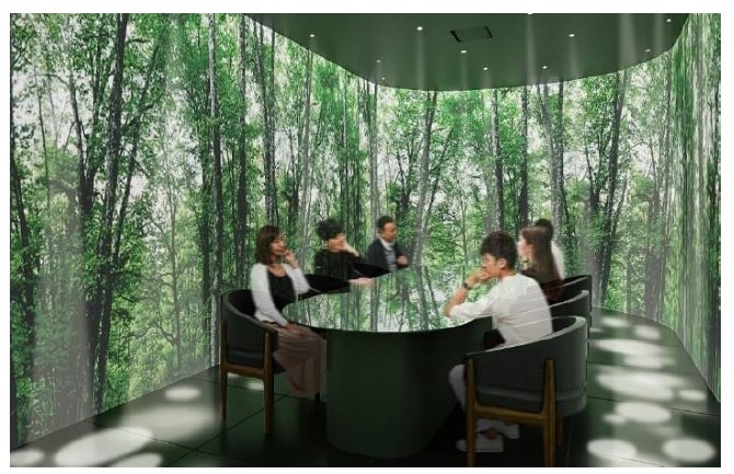 個室に入室した時は、屋外の空気環境が描かれており、徐々に室内の空気環境を反映した清々しい高原の絵画に変貌します。目に見えない空気の情報が生成AIによりアートへ変貌する最先端の技術を体感いただけます。