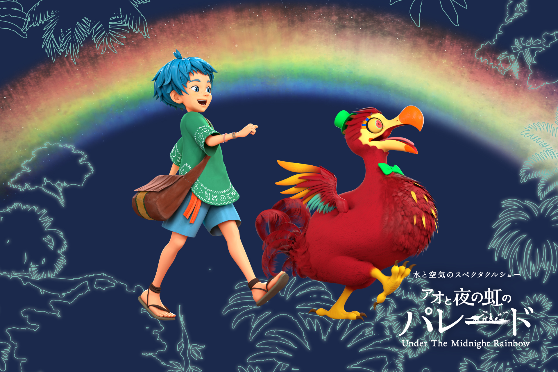 月夜に虹がかかる時、生きものたちによる祝祭が開かれるという言い伝えが残る島を舞台に物語が展開します。主人公の子ども「アオ」と水と空気の精霊「ドードー」が神秘的な夜の虹の下に出会い、楽しく華やかな生きものたちの祝祭が繰り広げられます。