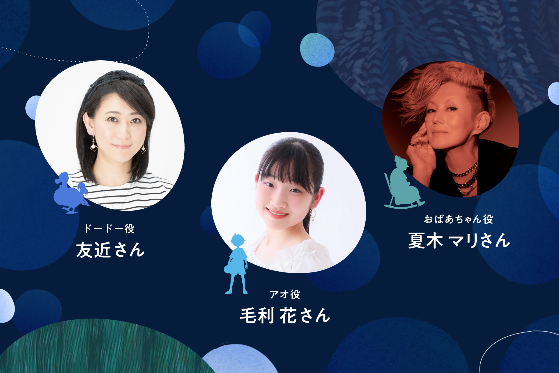 卓越した歌唱力と表現力が魅力の若手俳優、毛利 花さんを主人公の「アオ」役 に抜擢。透明感溢れる伸びやかな歌声が、ショーを華やかに彩ります。また、「アオ」を祝祭へと導く「ドードー」の声を務めるのは、個性的なキャラクターを多彩に演じ分けるタレントの友近さん。関西弁の軽快なトークがユーモアと親しみを与え、物語にさらなる魅力を加えます。そして、島に伝わる歌と夜の虹の言い伝えを「アオ」に教える「おばあちゃん」の声は、夏木 マリさんが担当。物語のはじまりにおいて重要な役割を果たし、観客をショーに引き込みます。
