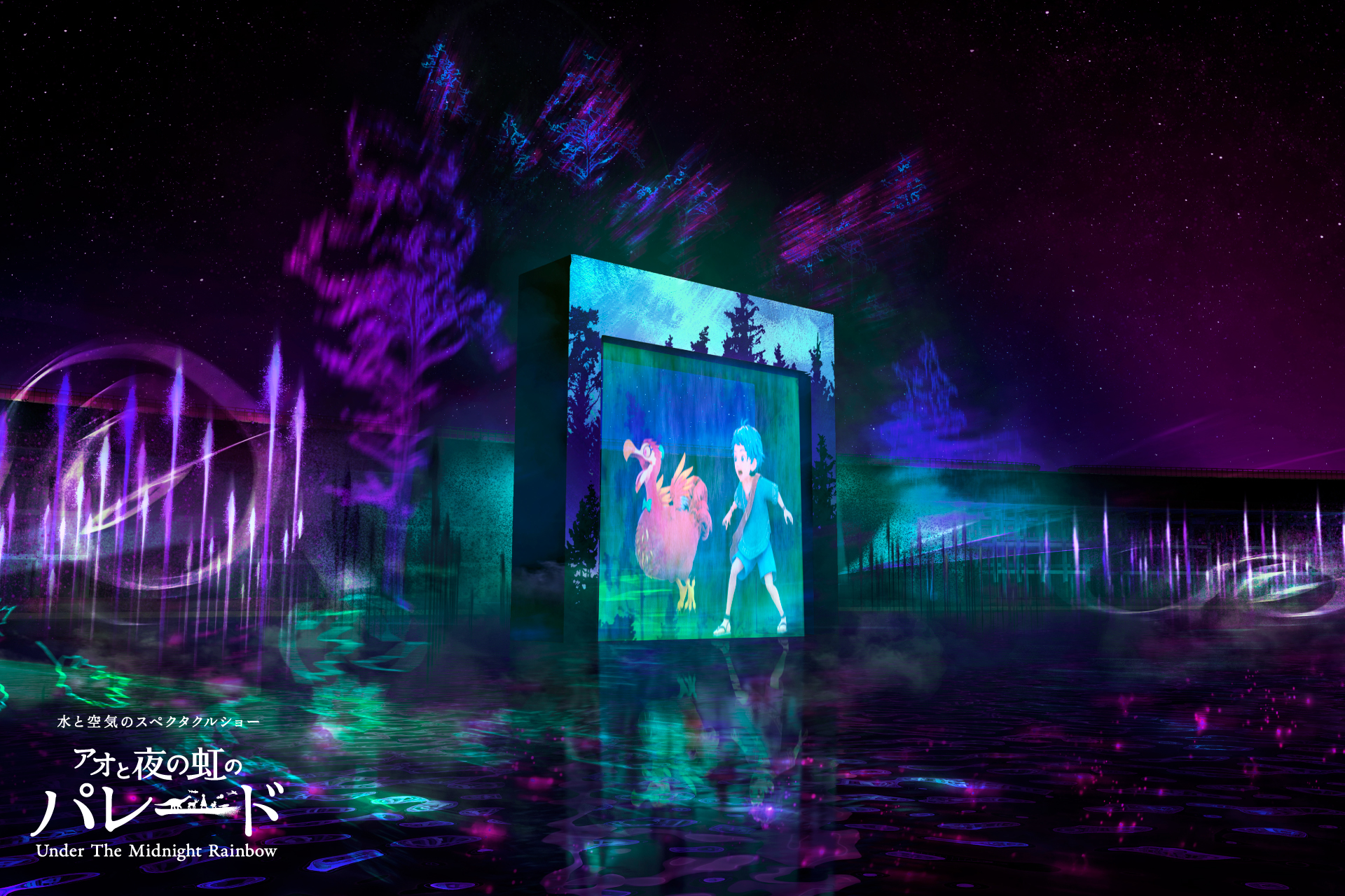 「アオと夜の虹のパレード」は、水、空気、光、炎、映像、そして音楽を駆使して、生命(いのち)の物語を壮大なスケールで描く水上スペクタクルショーです。