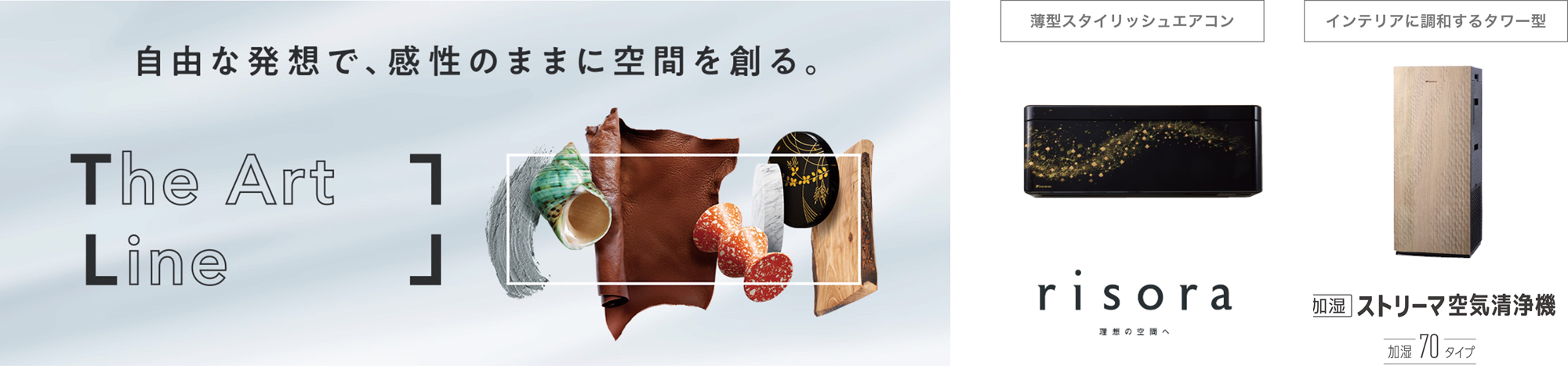 ダイキン工業株式会社は、自由な発想で、感性のままに空間をデザインするブランド『The Art Line(ジ・アートライン)』を新設します。第1弾として、薄さを訴求したルームエアコン『risora(リソラ)』および『加湿ストリーマ空気清浄機(70タイプ)』の正面パネルに伝統工芸品やアート作品、自然素材などのビジュアルや質感をデザインした商品を展開します。本商品は、ダイキンのショールームである「ダイキンソリューションプラザ フーハ東京・フーハ大阪」にて1月17日より予約販売を開始します。ダイキンの国内のショールームで商品を販売するのは初めてです。