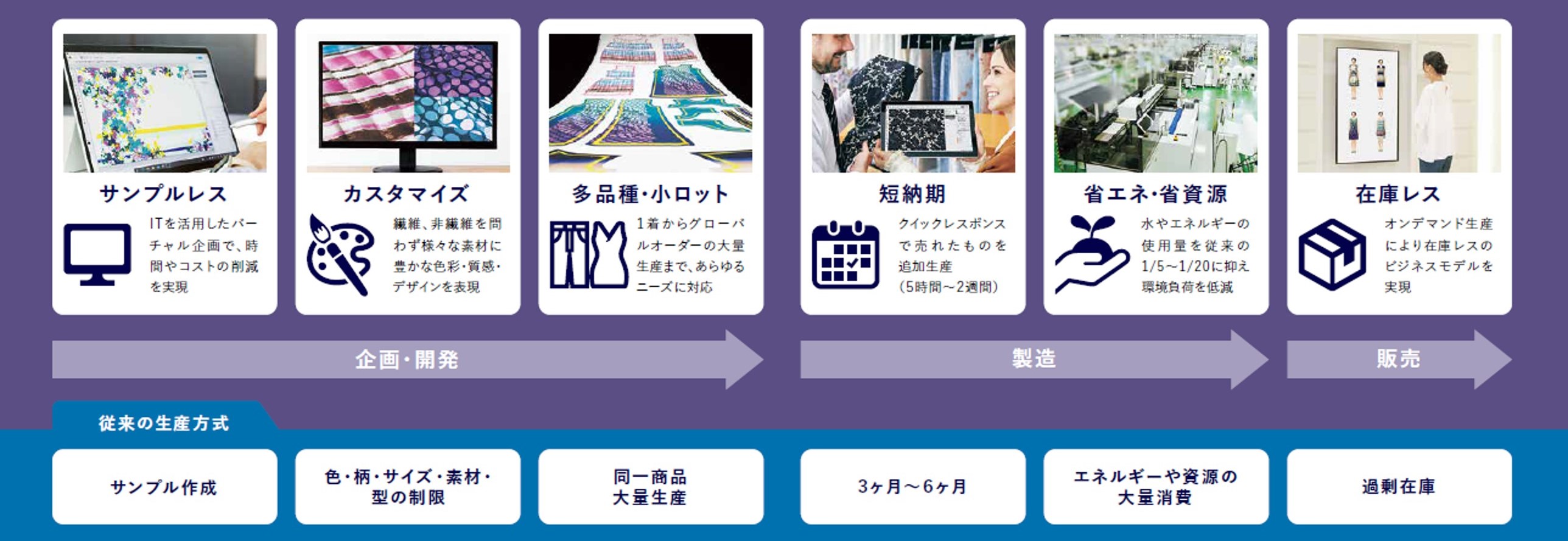 また、デジタルツールを活用したデザインのサンプル作成、修正、発注、生産で、デザインを決定してから短期間(約2週間)での納品を可能としています。