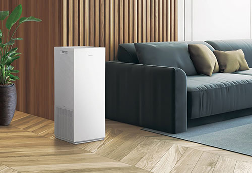 『加湿ストリーマ空気清浄機(70タイプ)』は、シンプルで美しく、落ち着いたデザインで生活空間への調和を追求するだけでなく、運転音の低減やお手入れのしやすさで暮らしに寄り添った空気清浄機です。操作部、表示も天面にすっきり収めて、どの角度から見てもインテリアにフィットする高いデザイン性を実現しています。吸い込み口と吹き出し口が離れて配置されているため、効率的に広範囲のホコリを収集することが可能です。また、吹き出し口が大きいため、吹き出される風は柔らく、快適性を実現しています。