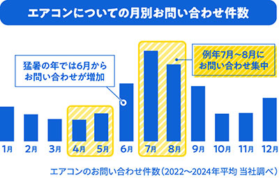 例年、エアコンのお問い合わせや点検のご依頼は、エアコンを使い始める6月頃から増え始め、7月、8月に集中します。混雑により暑い時期に修理対応をお待ちいただく場合があるため、本格的に暑くなる前の4月~6月前半に試運転を行い、早めに準備を済ませていただくことをご提案しています。