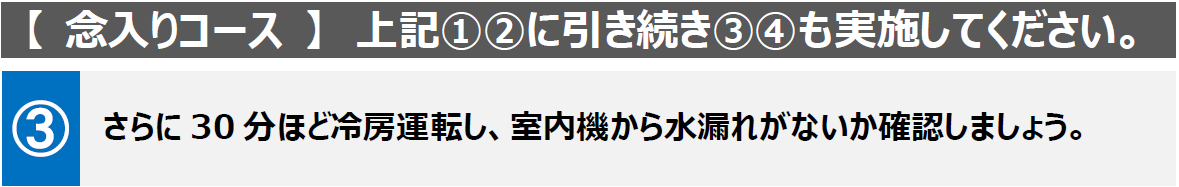 30分も待っていられない場合は、切タイマーの活用が便利です。なお、その場を離れる場合には、万が一の水漏れに備え、エアコンの下には物を置かないようにしましょう。