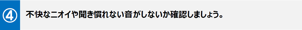 フィルターや熱交換器の汚れが過多となっている場合、嫌なニオイの原因になることがあります。また、振動が原因で異音に至るケースもあります。ぜひチェックをお願いします。