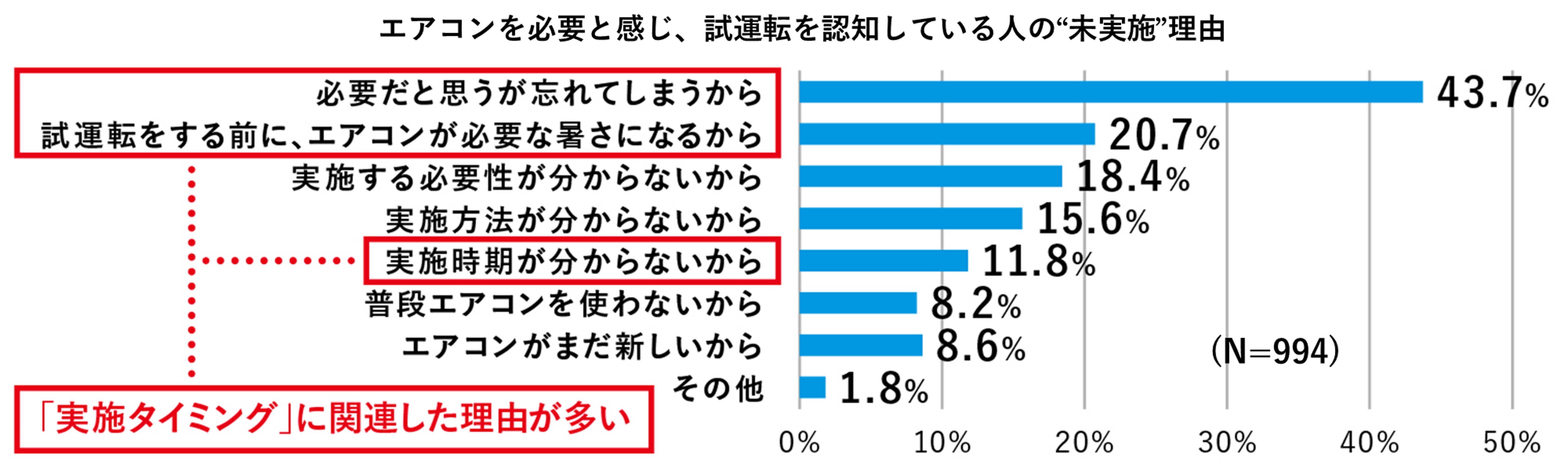 調査の結果、「夏を快適に過ごすために必要なモノ・設備」としてエアコンを挙げた方のうち、51.1%が試運転を実施していないことが明らかになりました。そのうち、試運転を知っているにもかかわらず、約半数が実施していないという結果がわかりました。実施していない理由としては、実施するタイミングを逃している方が多く、なかでも最も多かったのが「必要だと思ってはいるが、忘れてしまうから」という回答でした。エアコン試運転そのものは認識しているものの、気がついたら夏を迎えてしまっている人や適した実施タイミングを知らない人が多いことがうかがえます。このように、試運転やお手入れの重要性は理解されているものの、「忘れてしまう」「面倒に感じる」といった理由から行動に移せていない様子が浮かび上がりました。しかし、気づいたときにはすでに暑さが本格化しており、いざ使おうとしてもエアコンがスムーズに使えず、慌てて対応するケースも少なくありません。こうした中で、ダイキンは計画的にエアコンの試運転に取り組んでいただけるように、試運転に適した気温やタイミングがわかる「夏のエアコン試運転指数」や各地域でエアコン試運転指数が高まると思われる予想日を表す「夏の試運転前線」を公開しています。