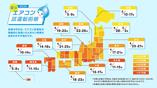 「夏のエアコン試運転指数」とあわせて考案した「夏のエアコン試運転前線」は、全国の各地域でエアコン試運転指数が高まると思われる予想日を表すものです。エアコン試運転指数が高く、より効果的な試運転ができると考えられる気温25℃の日がいつ頃やってくるのかを前もって把握できるため、計画的な試運転の実施に役立てられます。
