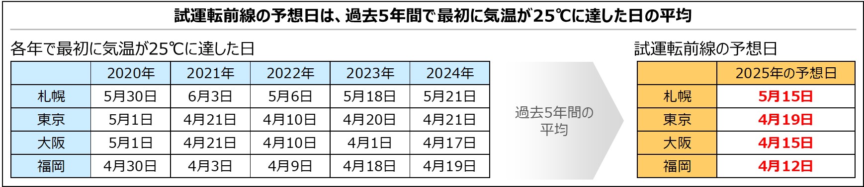 本前線に記載の予想日は、全国の各地域の過去5年間において、各年の最高気温が25℃に達した最初の日を調査し、それらを平均した日としています。