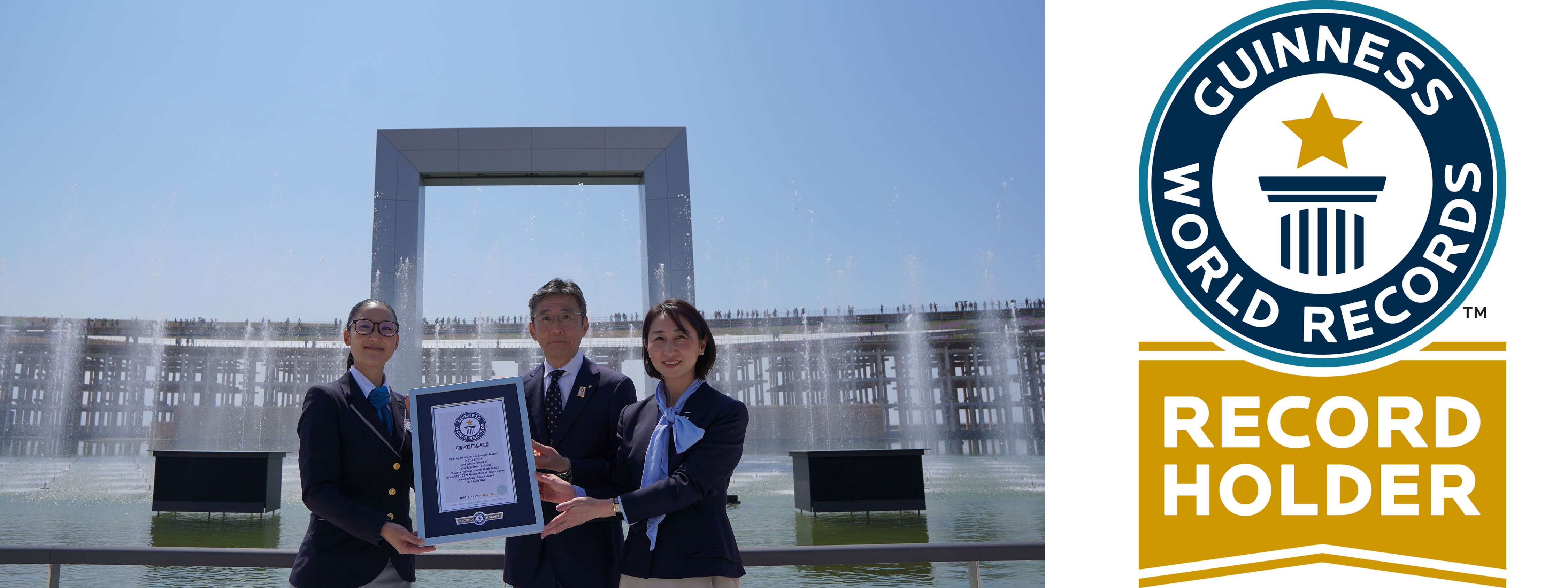 サントリーホールディングス(株)とダイキン工業(株)が、2025年日本国際博覧会(大阪・関西万博)において共同で実施するエンターテインメント「水と空気のマジカルダンス」が、「最大のインタラクティブな噴水設備※1」として2025年4月7日(月)にギネス世界記録™に認定されました。同日、当記録の認定式が万博会場内「ウォータープラザ」で実施され、ギネス世界記録公式認定員から認定証が贈呈されました。
