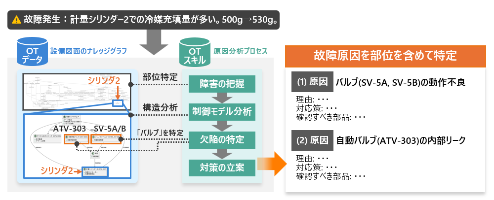 本件は、ダイキンと日立がそれぞれ長年培ってきた現場のOT*1ナレッジと、日立の先進的なITを融合させた取り組みです。タブレット端末などを手にした保全技術者が、生産設備の点検を行う過程でポンプやバルブなどの故障を発見したときに、設備故障診断AIエージェントは、その原因と対策を保全技術者に提示します。具体的な仕組みとしては、まず、ダイキンが蓄積してきた各種の生産設備やユーティリティ設備といった工場設備の図面をナレッジグラフ*2として生成AIが読み取ることができる形に変換します。そして、そのナレッジグラフおよび保全記録などの「OTデータ」と、STAMP*3などに基づく日立独自の設備故障原因分析プロセス*4である「OTスキル」を生成AIに学習させることで、ダイキンの一般的な保全技術者と同等以上の故障診断を実現します。なお、事前に実施した実証実験では、設備故障診断AIエージェントが10秒以内に、90%以上*5の精度で設備故障の原因と対策を回答できることを確認しています。
