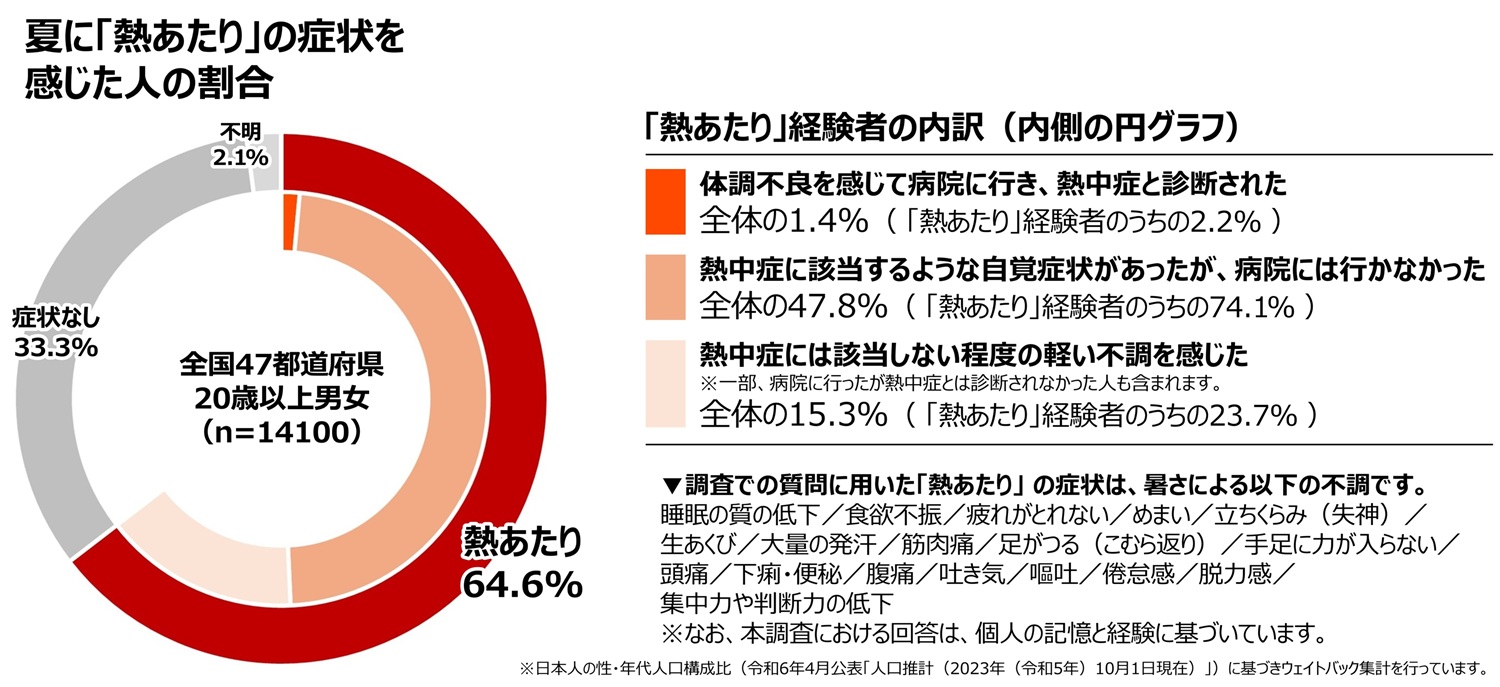 今回、熱中症と診断されるような症状から軽い不調までを含めた「熱あたり」の症状を感じた経験がある人を調査したところ、2024年の7月から8月の間に、全国20歳以上男女のうち、おおよそ3人に2人にあたる64.6%が「熱あたり」の状態を経験した可能性があることが明らかとなりました。