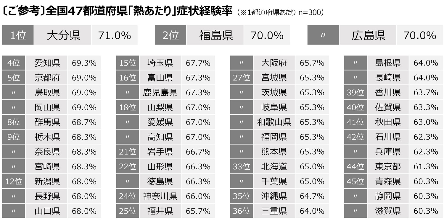今回の調査で得られた回答をもとに、「熱あたり」症状経験者の割合を全国47都道府県ごとに算出しました。最も割合が高かったのは大分県で、次に福島県と広島県が同率で続く結果となりました。最も割合が低かったのは、同率で青森県、静岡県、滋賀県でした。