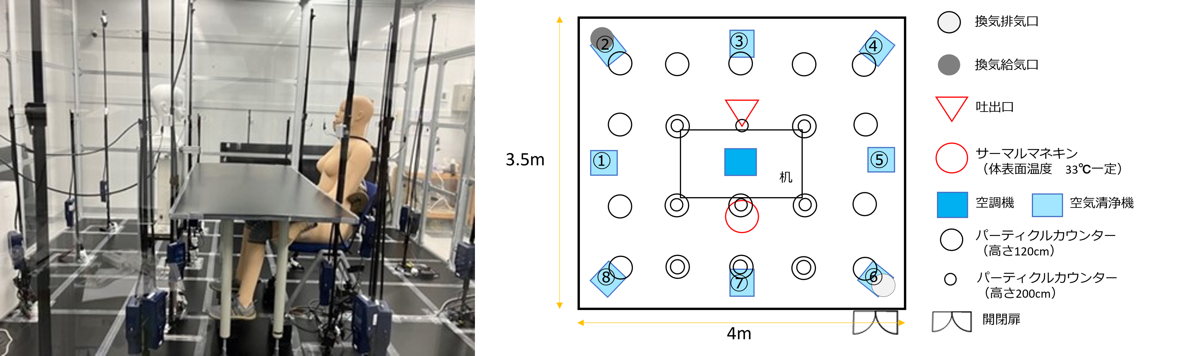 本検証では、産総研内のクリーンブース(4m×3.5m×2.4m)内でエアロゾルを吐き出す感染者と非感染者の対面での会話を想定し、実測でのエアロゾル濃度とダイキンの簡易シミュレーションデータとの比較を行いました。さまざまな空調システム条件下での検証により、以下の結果が得られました。