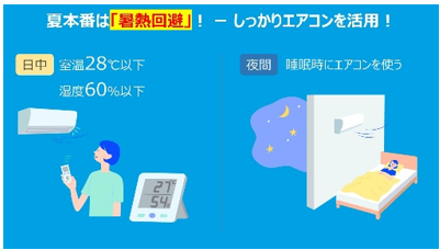谷口先生:夏前に行ってほしい熱あたり対策は、「暑熱順化」です。ウォーキングや軽い運動、入浴などで汗をかける「体の中に熱をためない」体づくりが大切です。夏本番は、「暑熱回避」が重要です。室内ではエアコンを適切に使い、熱あたりしない環境づくりを徹底してください。屋外では各自治体などが設置している「クールシェアスポット」を暑熱回避する場所として是非活用してください。