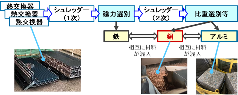 熱交換器は、空調機において空気を冷やしたり暖めたりするための重要な部品の一つで、内部の銅管を流れる冷媒の熱を、アルミフィンを通じて空気に伝えます。使用済み熱交換器のマテリアルリサイクルでは、一般的に熱交換器をシュレッダーにかけて細断し、使用されているアルミ・銅・鉄などが金属毎に選別されますが、選別されたアルミの成分に、銅やその他不純物が含まれてしまい、高い加工性が求められる熱交換器用フィン材への水平リサイクルは困難でした。
