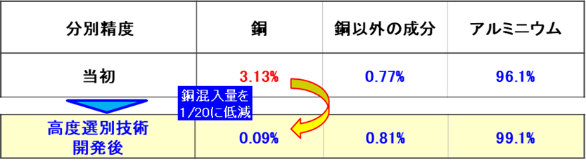 表1 日本磁力選鉱で実証したアルミの高度選別結果