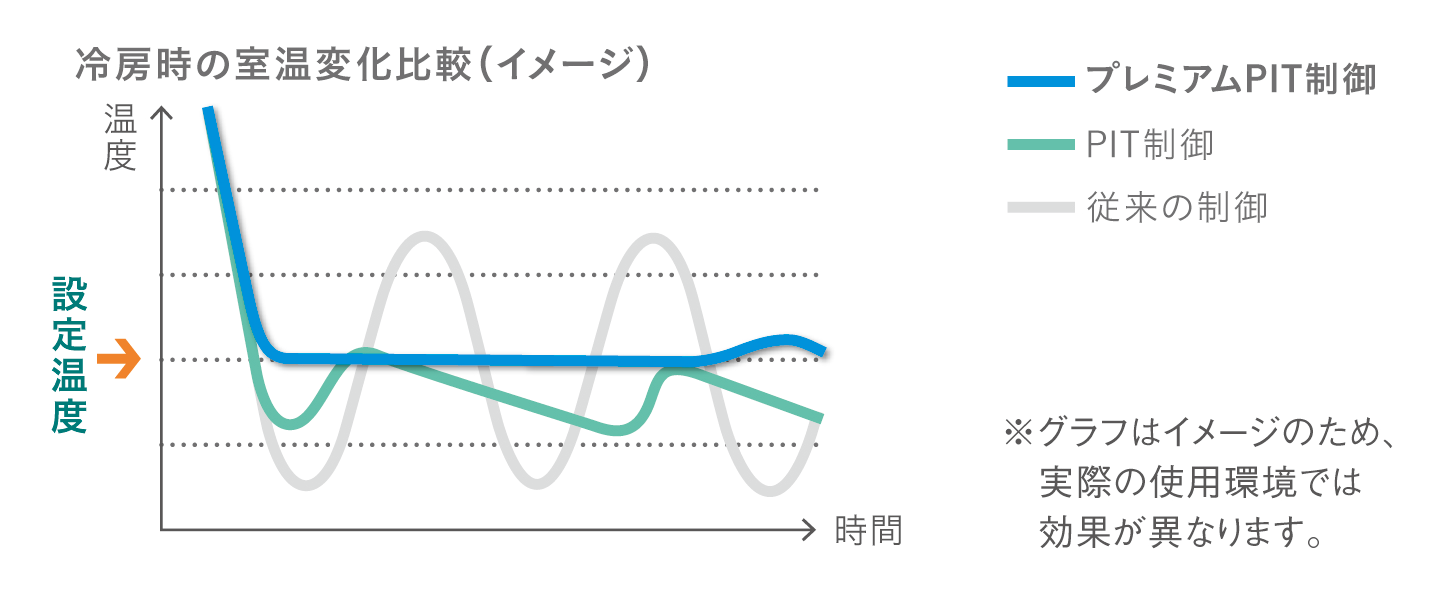ダイキン独自のスイングコンプレッサーと新たな制御を搭載した電子膨張弁の連動で、冷媒温度をきめ細かくコントロールし、消費電力の低減に貢献する「プレミアムPIT制御」を搭載しました。冷房最小能力を従来の約40%低減した0.3kWでの運転を実現し、例えば春や秋、夏場の夜間に加え、断熱性能の高い住宅などエアコンにかかる負荷が小さい環境で、出力を落としながら効率よく運転します。また、圧縮機のオン・オフの頻度が抑えられ、室温変化の少ない快適な環境を維持します。