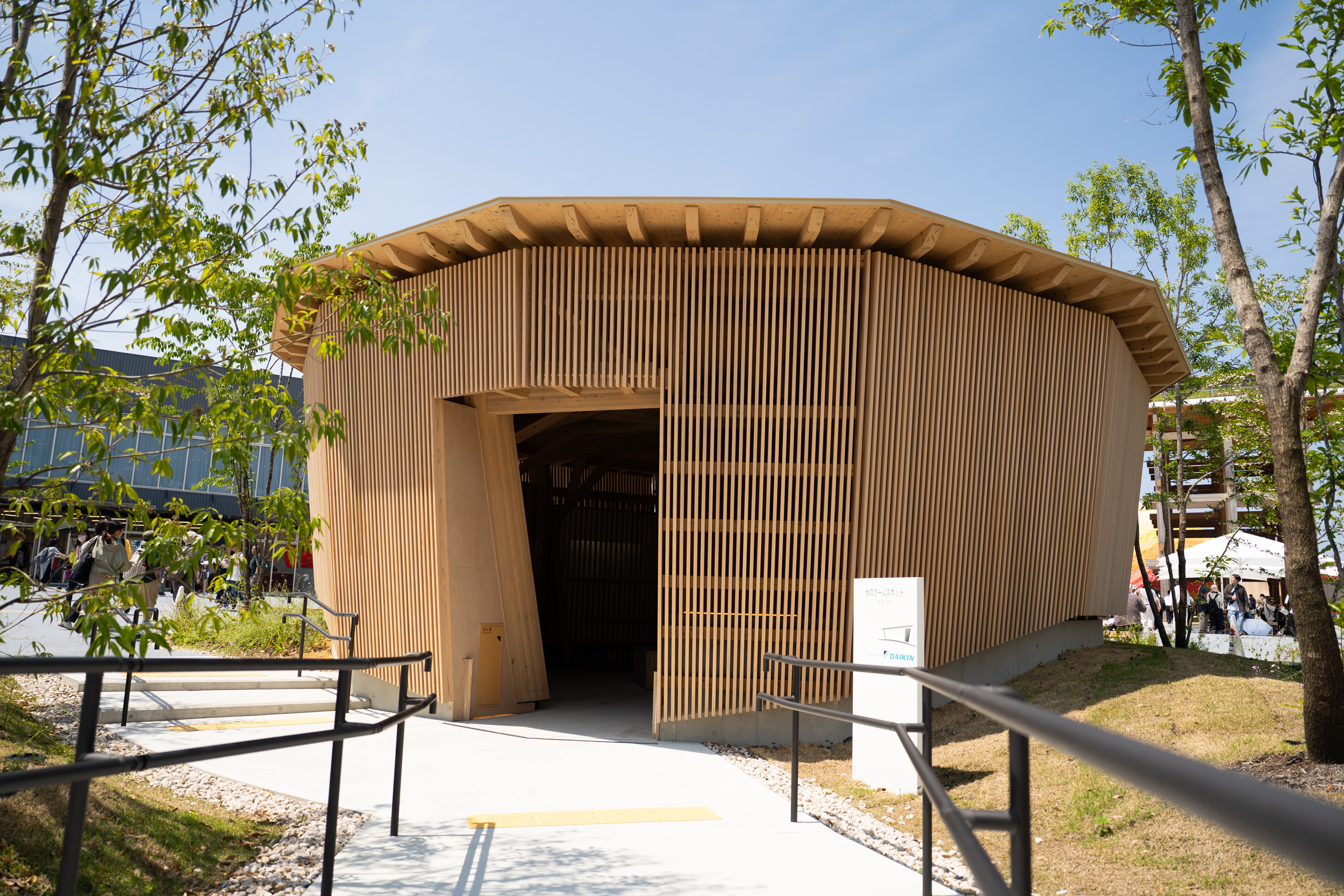 大阪・関西万博の暑さ対策として設置した、自然エネルギーを利用した休憩所です。氷や雪を貯蔵する伝統的な氷室から着想を得ており、氷蓄熱空調※2の技術を活用して自然で涼しい環境を提供します。太陽光パネルで発電した電力を一部利用して生成した氷による冷輻射※3によって、氷室にいるような心地よい涼しさを届けます。内壁と外壁には日本古来の木組み格子を使用し、外気の侵入を防ぎながらも陽の光が入る開放的な構造を取り入れています。格子による木造建築と緑色の太陽光パネルの採用することで、周囲に溶け込む外観デザインを実現しています。