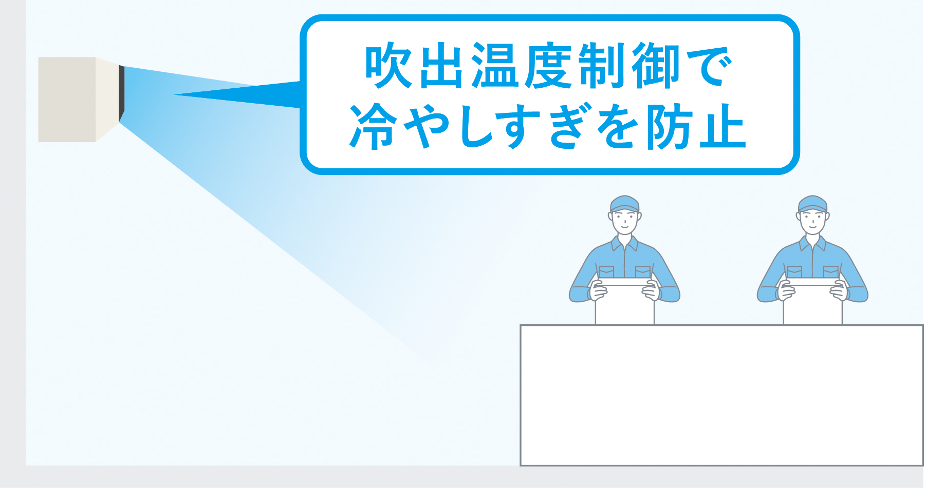 また、室内温度ではなく吹き出す空気の温度を基準に制御する「吹出温度制御」を採用することで、空間全体の温度変化に左右されることなく、必要なエリアに適切な温度の気流を届け、必要以上の電力消費を抑制しつつ、空間での快適な環境づくりに貢献します。
