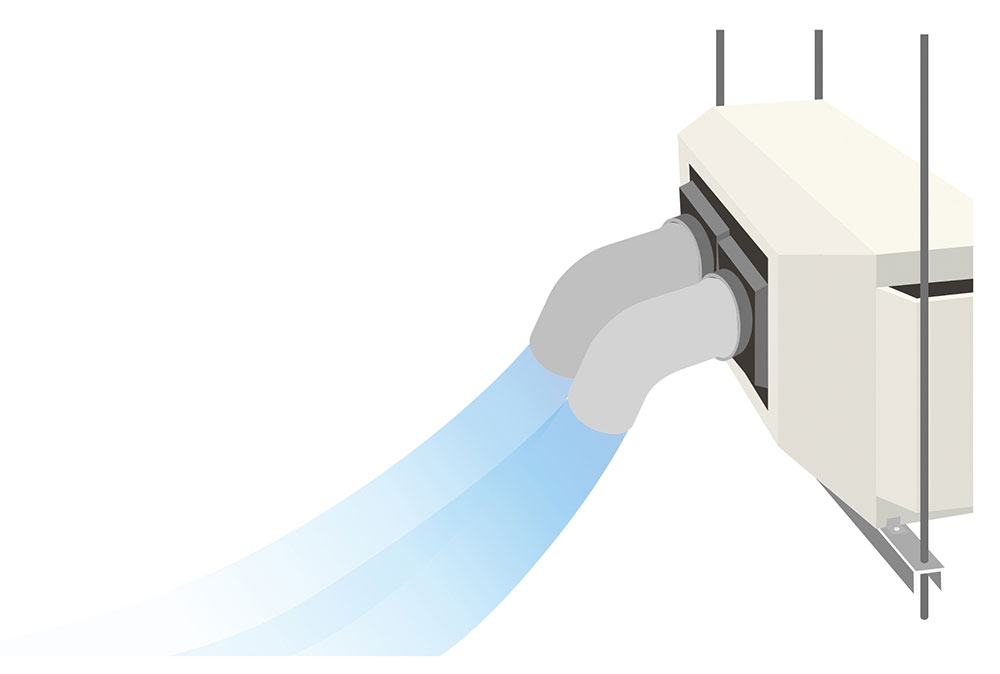 従来の吸込温度制御に加え、吹出温度制御を採用し、作業者が「涼しい」と感じる温度の空気を届けることで、中間期の冷えすぎを抑え、快適性と省エネ性を両立します。さらに暖房時には、吹出空気温度の過度な上昇を抑えることで暖気の上昇を軽減し、床面まで気流を届けやすくすることも可能です。また、用途に応じて吸込温度制御へ切り替える※3ことも可能で、体育館など空間全体の均一性を重視した空間にも対応します。また、別売品の吹出口アダプターとダクトを付けることで、より狙った場所へ風を届けることも可能です。※4