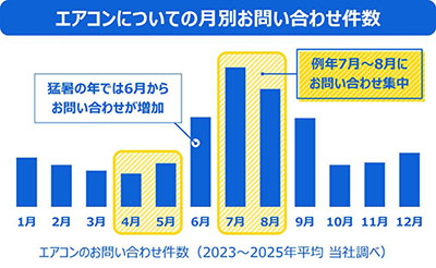 例年、エアコンのお問い合わせや点検のご依頼は、エアコンを使い始める6月頃から増え始め、7月、8月に集中します。混雑により暑い時期に修理対応をお待ちいただく場合があるため、本格的に暑くなる前の4月~5月に試運転を行い、早めに準備を済ませていただくことをご提案しています。