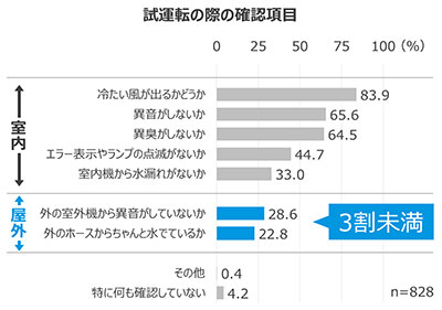 エアコン試運転をしている人に、試運の際の確認項目を聞いたところ、最も多かったのは「冷たい風が出るかどうか」で、上位には室内機の確認項目が並びます。普段あまり意識することがない屋外にある室外機の異音や、冷房時に発生する結露水を屋外へ排出するドレンホースを確認している人は少なく、どちらも3割未満でした。