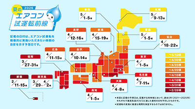 このような結果から昨年に引き続き、計画的なエアコン試運転のサポートを目的にダイキンが考案した「夏のエアコン試運転指数」と2026年版の「夏のエアコン試運転前線」とともに、10分ほどで行えるお手軽な正しい試運転方法や節電にもつながる日頃からできるエアコンのお手入れ方法をご紹介いたします。全国的な猛暑が予想されるこの夏、エアコンが使えず熱中症の不安を抱えて不快な日々を過ごすことなく快適に暮らしていただけるよう、ぜひお役立てください。