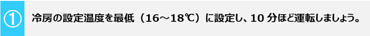 エアコンの状態を確認するには、設定温度と運転時間が重要です。エアコンは室温が設定温度に到達すると冷房運転を弱めたり停止したりするため、不具合の有無を十分に確認できない場合があります。そのため、室温が設定温度にすぐに達することを防ぐために最低温度に設定し、10分以上運転することが推奨されています。