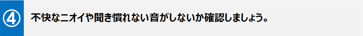 フィルターや熱交換器の汚れが過多となっている場合、嫌なニオイの原因になることがあります。また、振動が原因で異音に至るケースもあります。ぜひチェックをお願いします。