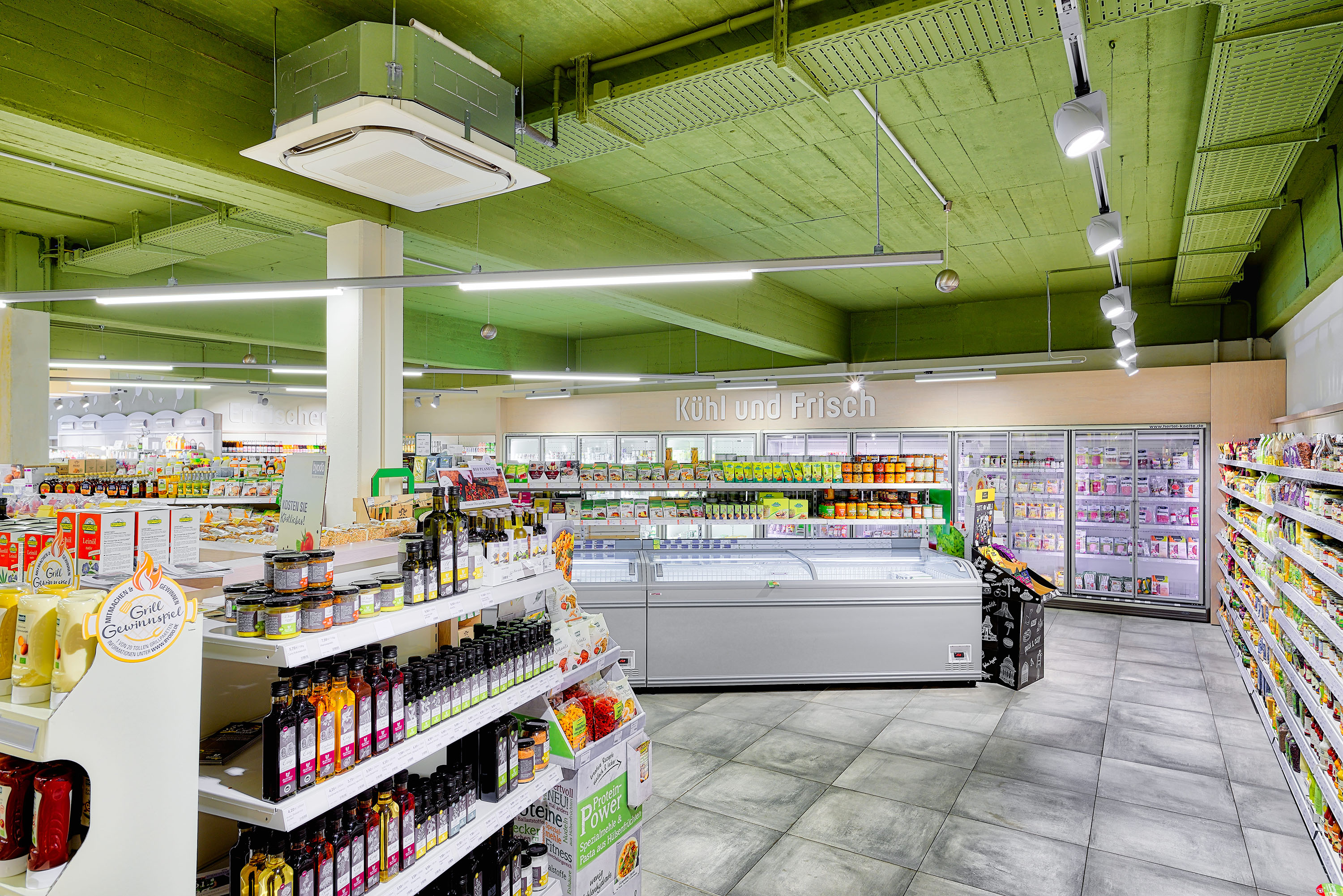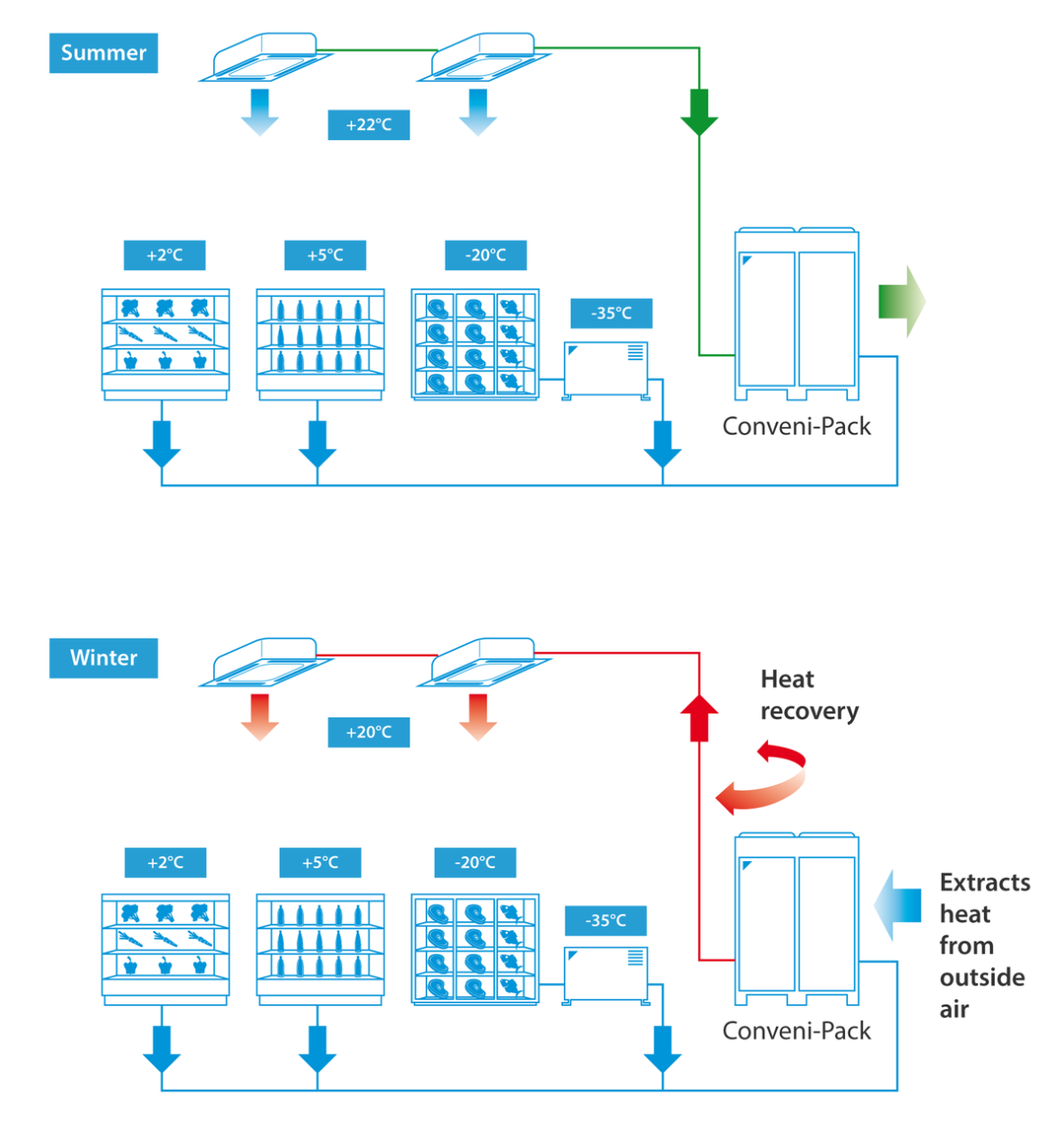 ヨーロッパで多くの食品スーパーで採用されている製品の一つに、冷凍・冷蔵・空調を同じシステムに統合した「コンビニパック」があります。小売店における電力消費の大半を占める空調と冷凍・冷蔵設備を一つに統合することで、それぞれ独立している従来方式に比べ、年間消費電力を約50%も抑えられます。