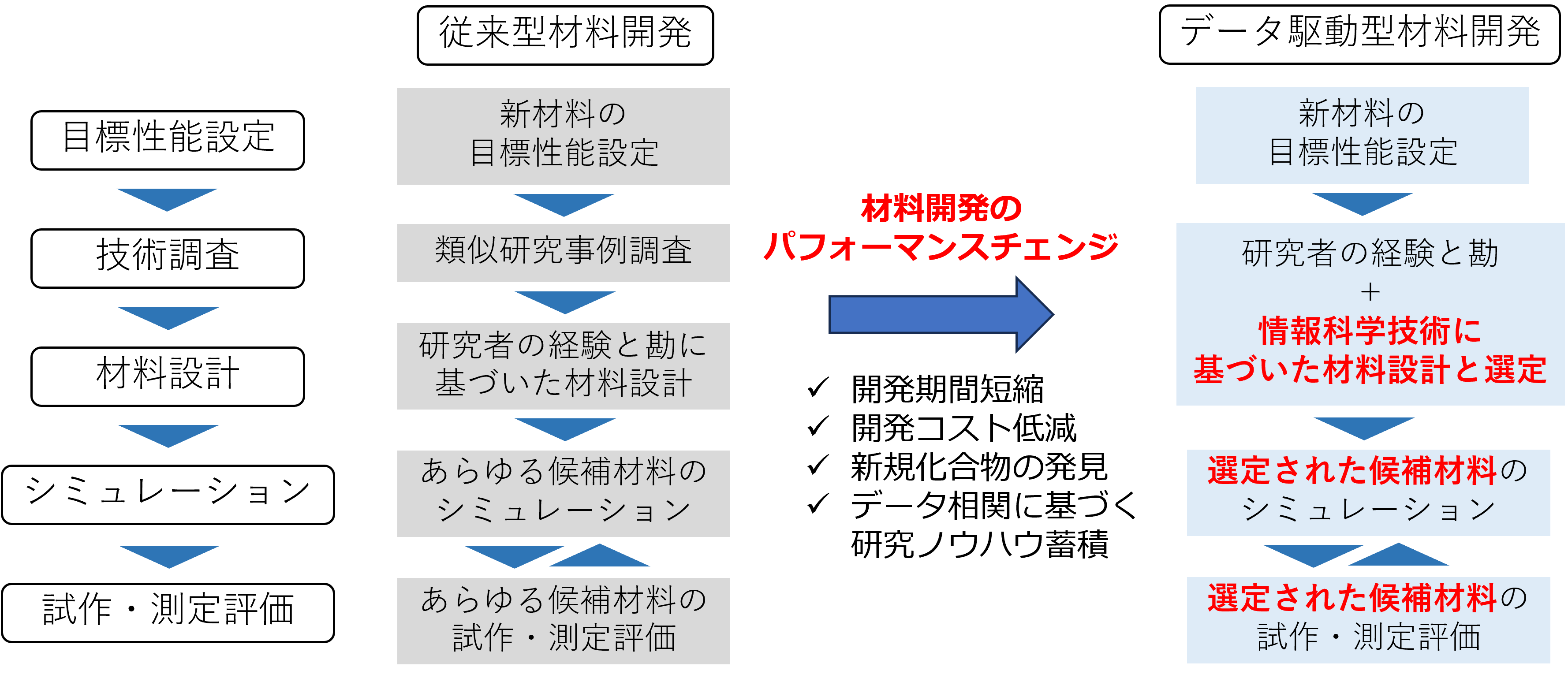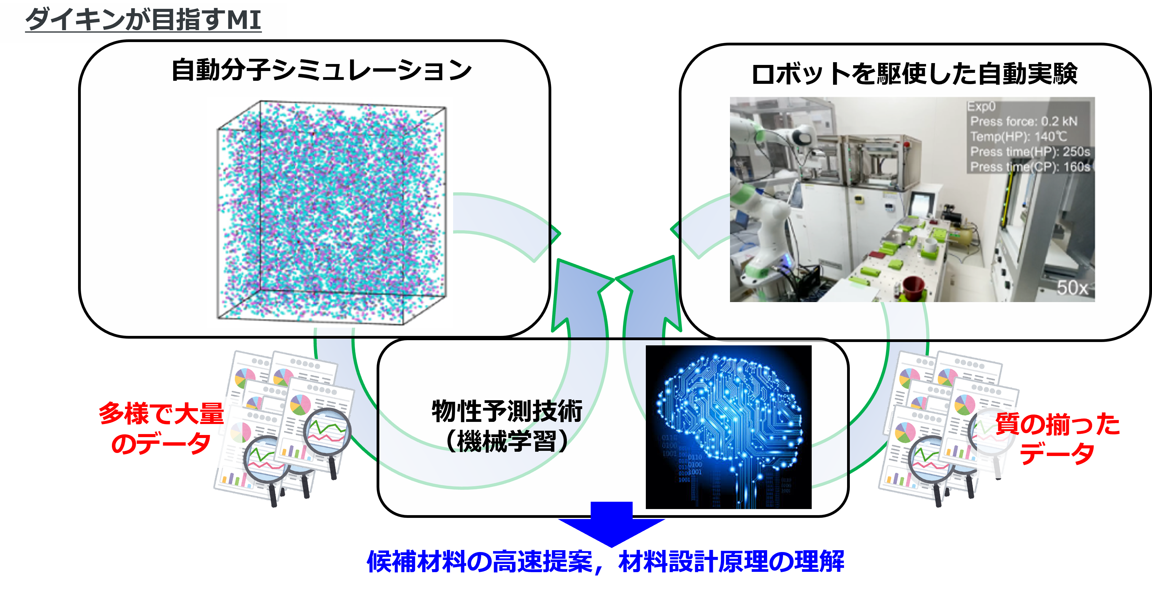 そこで良質かつ大量のデータを生成する技術と、高精度な物性予測技術を構築することで、材料候補を高効率に探索するMI活用を目指しました。そのために自動分子シミュレーションと、ロボットを駆使した自動実験を軸に技術開発を進めました。今回の取り組みでは、高分子・複合材料を対象にしていますが、その中でも高周波向け基板材料をターゲットに設定しました。