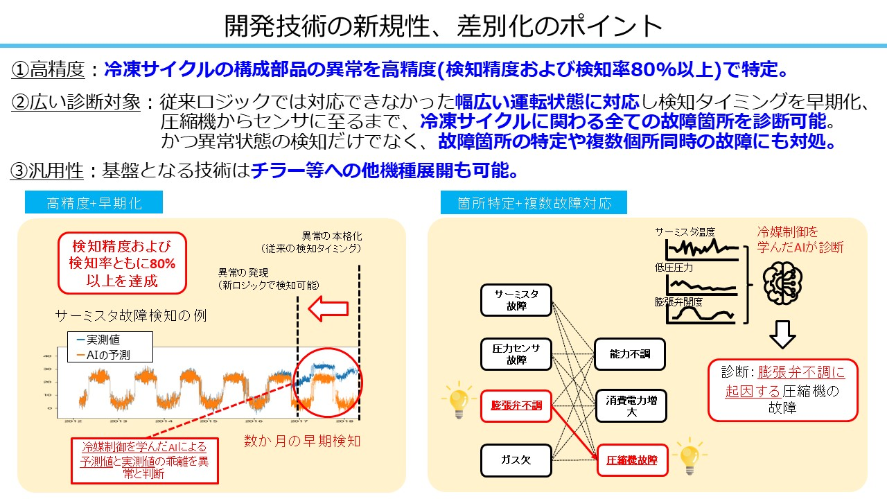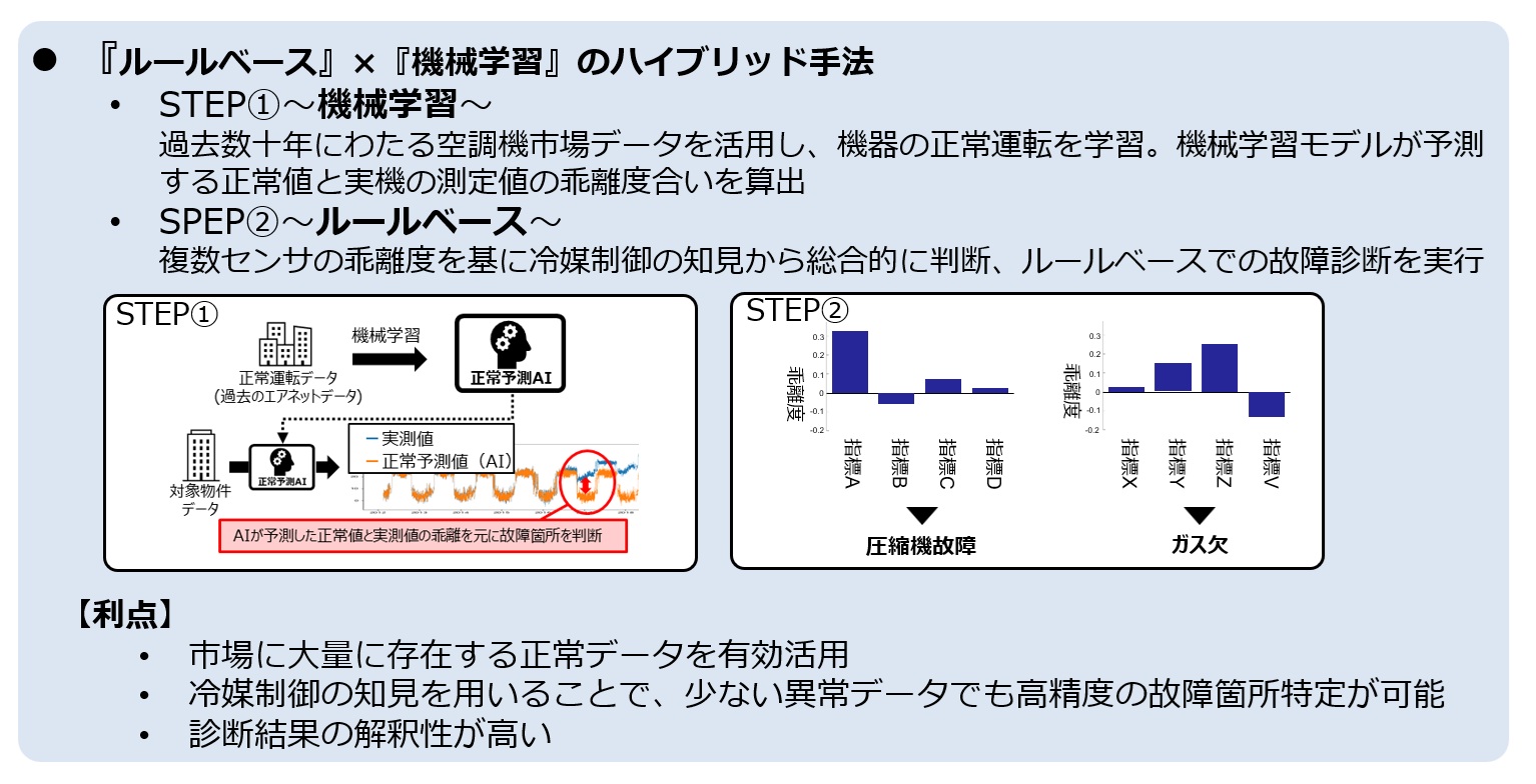 従来、空調の異常検知では、事前に設定したルールに基づく異常検知(故障診断)を行っていました。しかし、空調機は外気温や運転状態によって、「正常値」が変わるという特性を持っています。例えば、「あるサーミスタの温度が60℃以上ならガス欠(冷媒ガス欠)」というルールを作ったとします。しかし、そのルールに合致したとしても、実際にガス欠になっていることもあれば、外気温や圧縮機の回転数によっては正常な運転の範囲内ということもあるのです。