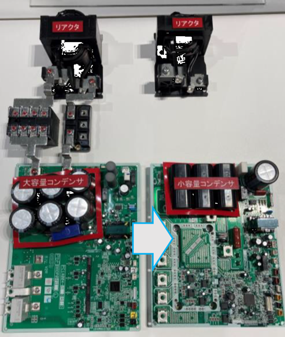 たとえば、業務用では当時、基板上に大容量の電解コンデンサを6個も搭載していました。それらを取り去って約30分の1の小容量コンデンサに変更し、コストダウンを図りました。この技術によって、従来インバータに比べて約40%のコストダウンが実現できました。というのも電解コンデンサの削除だけでなく、力率(流れる電力のうち有効活用される割合)を改善するリアクトルの小型化や、電解コンデンサを充電するための充電回路の削除も可能であり、電解コンデンサレス化はコストダウンと同時にインバータの寿命も伸ばせるため、一挙両得の技術なのです。