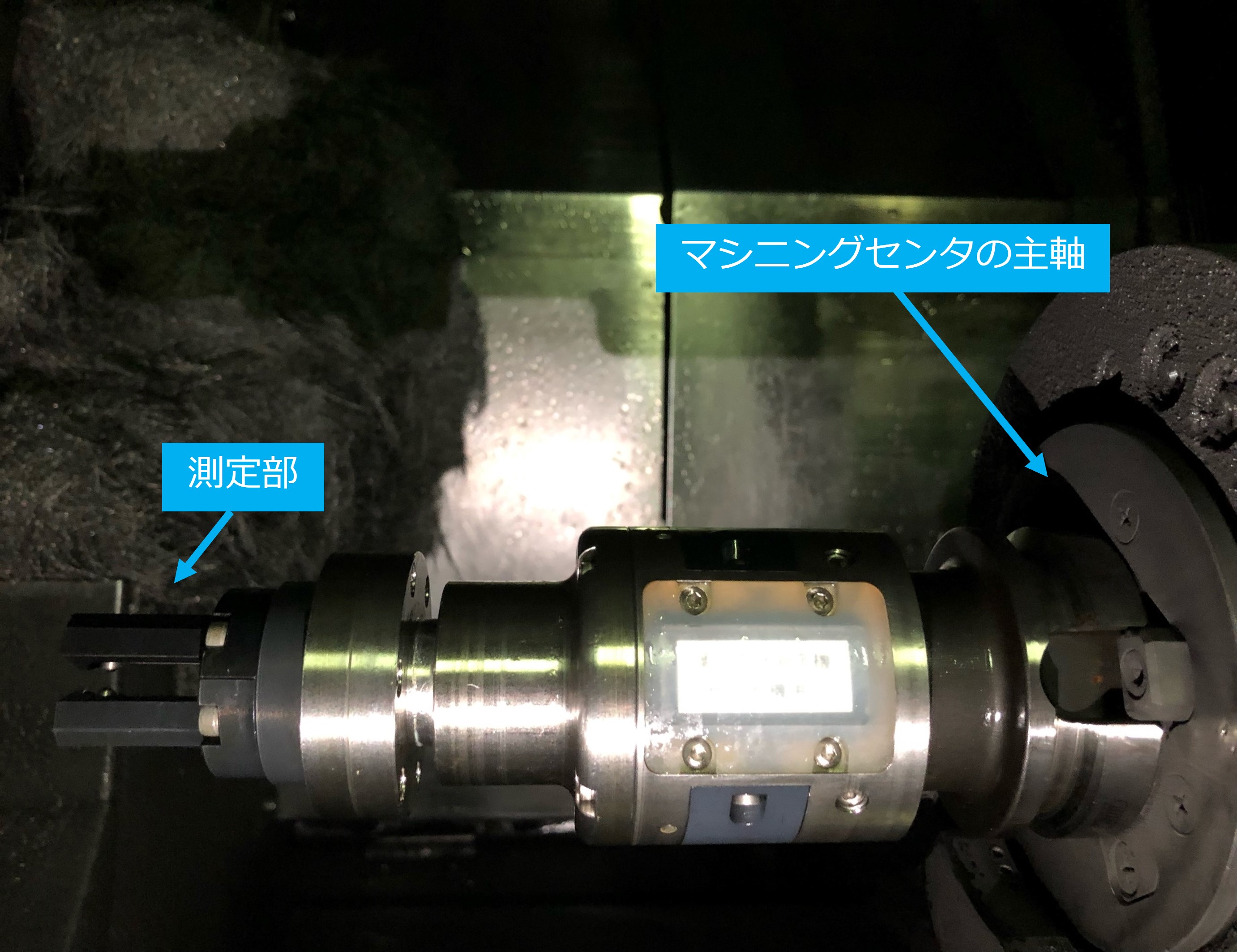メーカーに依頼して製作した設備内の測定機。マシニングセンタに機内測定用の専用ツールを取り付け、加工中の測定データをフィードバックして高速・高精度で加工を行う。