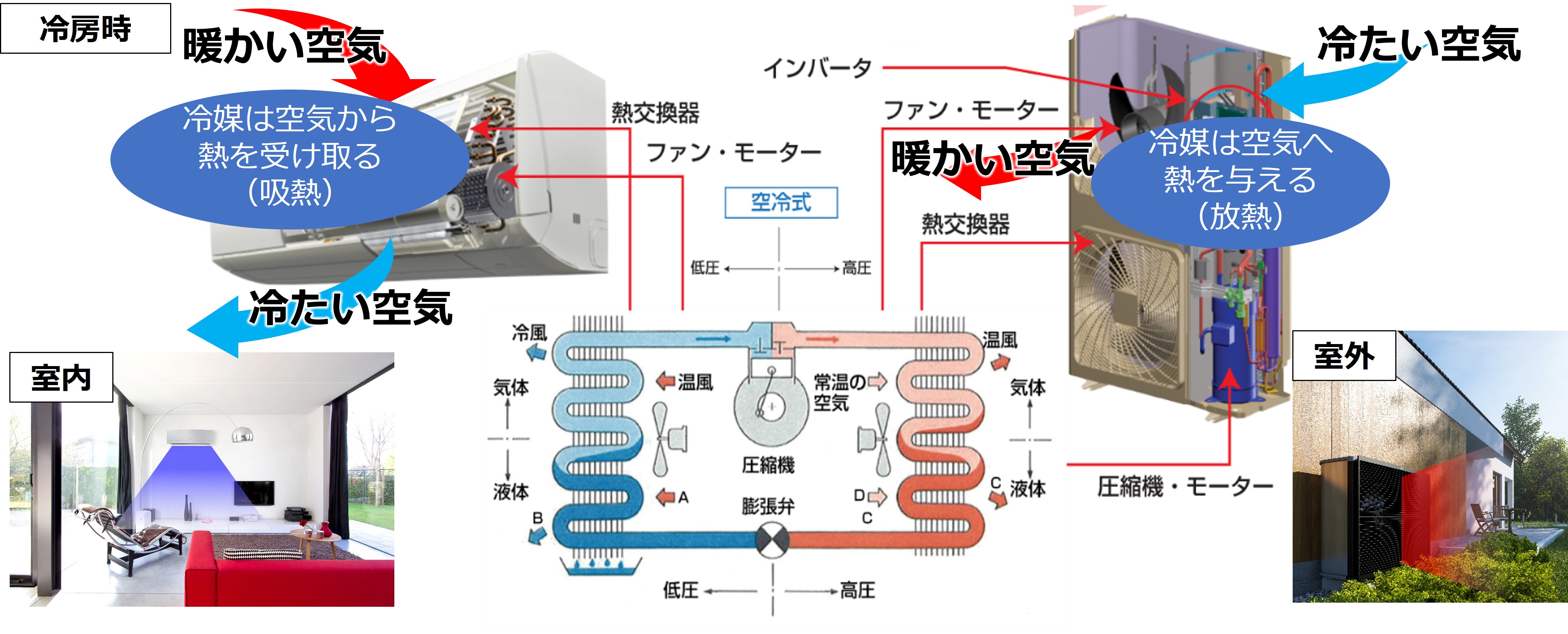 冷媒は(室外機の)圧縮機により昇圧・昇温され、室外機と室内機を接続する配管内に流れて、(室内機の)熱交換器を通じて熱を室内の空気に伝えたり、奪ったりすることで熱を移動させます。圧縮機と熱交換器で冷媒が蒸発・凝縮する際の気化熱・凝縮熱によって、より大きな熱を移動できるのです。