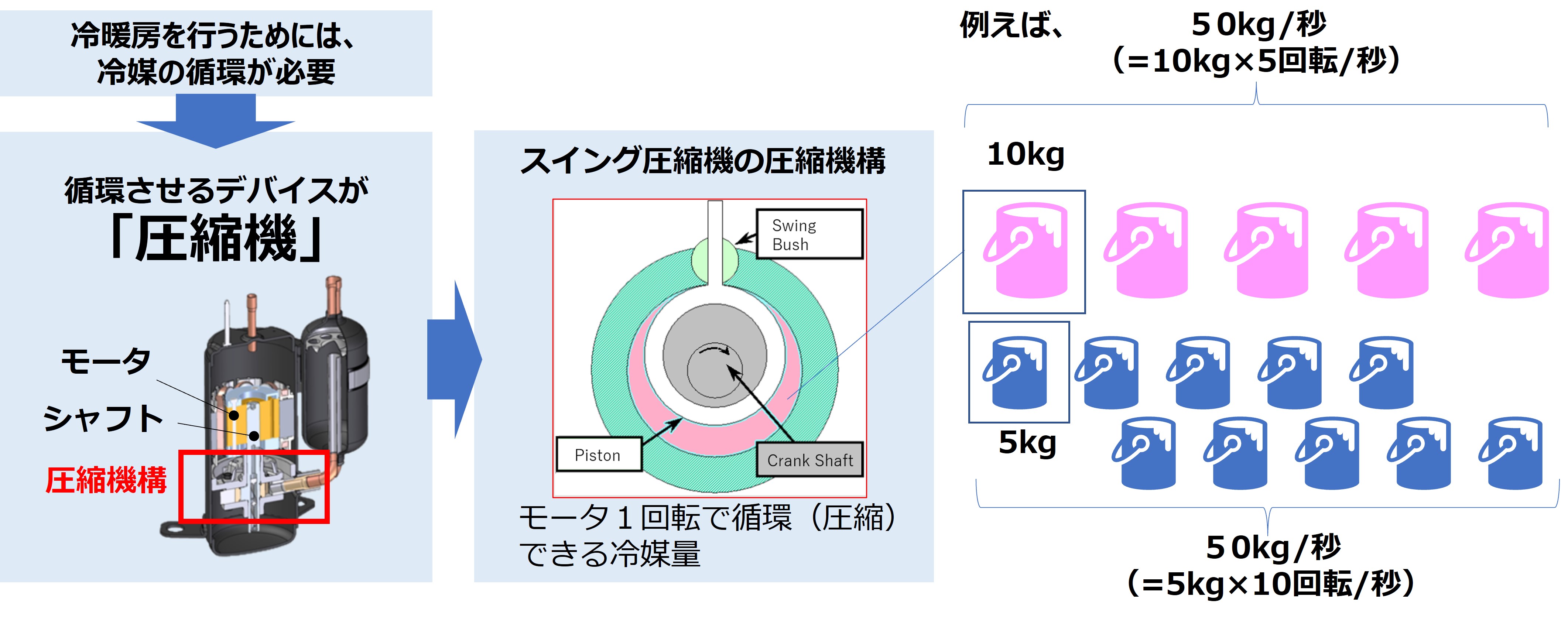 西村:冷暖房するためには、熱を運ぶ冷媒を循環させることが必要です。ヒートポンプの冷暖房能力は、冷媒の熱をバケツリレーで運ぶことに例えると理解しやすいでしょう。ある熱量を運ぶとき、熱を入れるバケツの容量を小さくして、バケツを運ぶ数を増やせば、同じ熱量を運べることになります。例えば10㎏のバケツを5回転/秒で運んでいたとして、それを5㎏のバケツで10回転/秒で運べば、同じ熱量を運べることになります。
