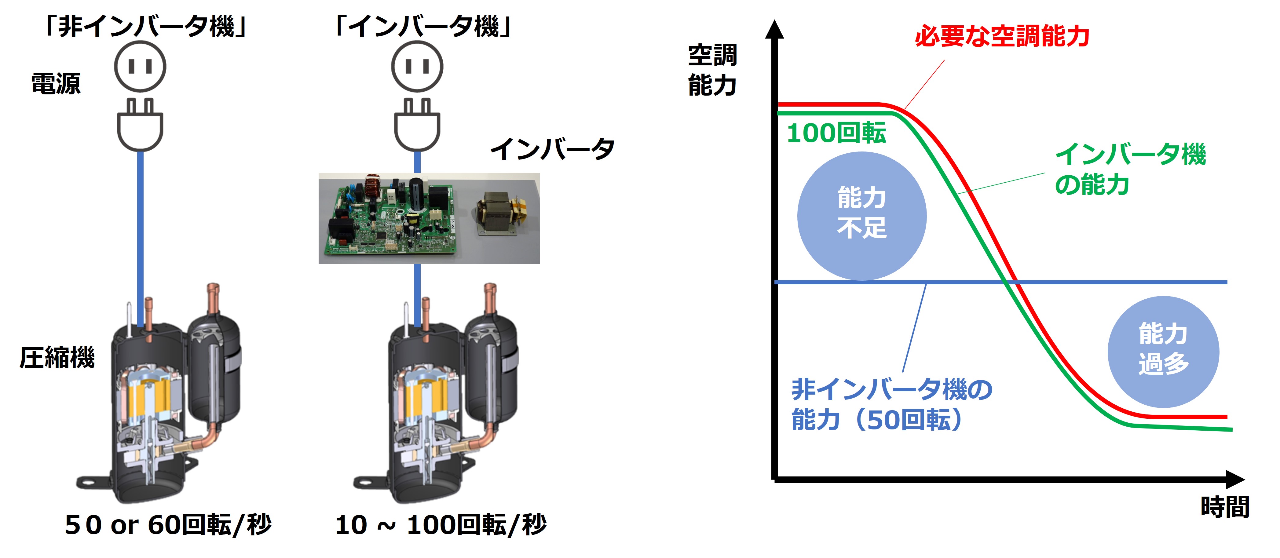 このほか、圧縮機のモータとインバータを組み合わせた効率化を工夫している点も特徴です。圧縮機のモータの制御部は、電源周波数(50/60Hz)によって回転数が決まる非インバータ機と、回転数を自在に制御できるインバータ機に分けられます。我々は独自のインバータ機を開発しており(※2)、エアコンに必要な空調能力に対して適切な出力で圧縮機を稼働させることで、速冷速暖、温度変化の抑制といった快適性や省エネ化を実現しています。