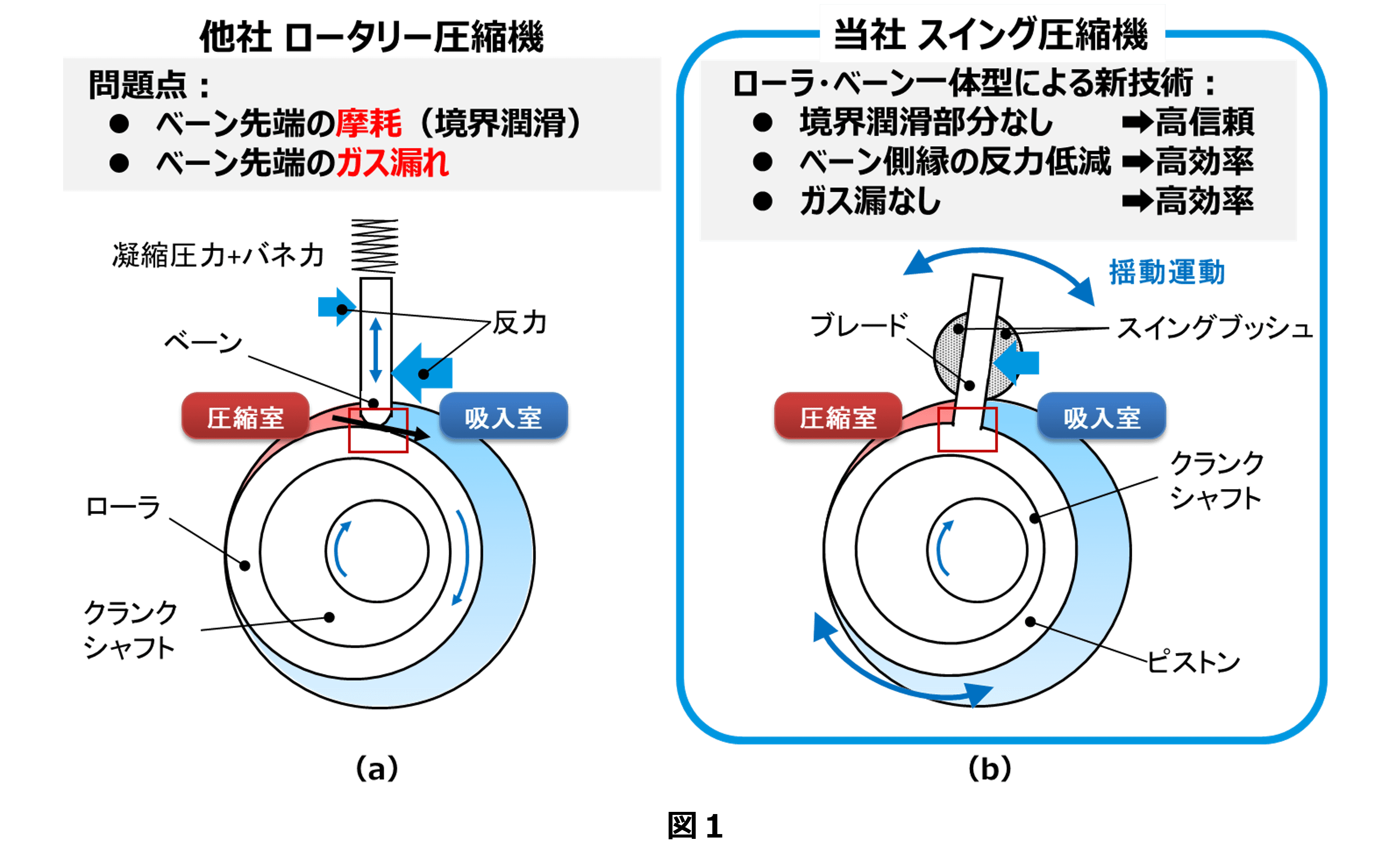 「R22」は塩素を含む冷媒ですが、「HFC」は塩素を含みません。塩素がなくなるとベーンの先端の潤滑が厳しくなり、ベーンの材料見直しやローラに押し付けるバネの荷重を調整する必要があったのです。(図1(a))構造面から見直す絶好のタイミングとなりました。