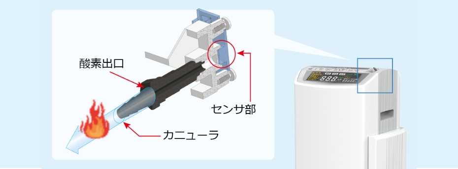 | 警報機能 | 電源確認、濃度低下、チューブ折れ、始動期間、異常(圧力、制御、流量、コンプレッサ、高温、火炎検知) |